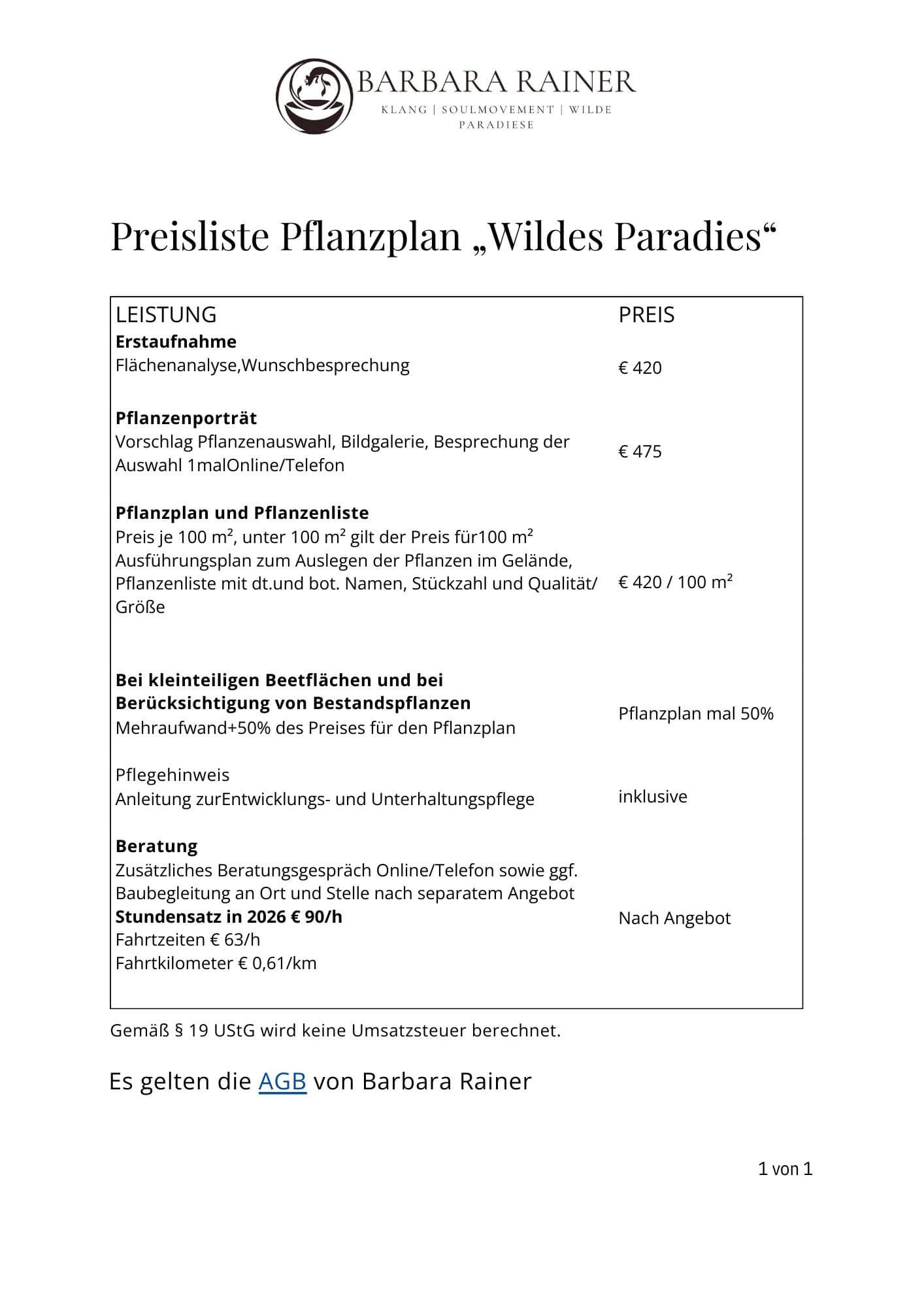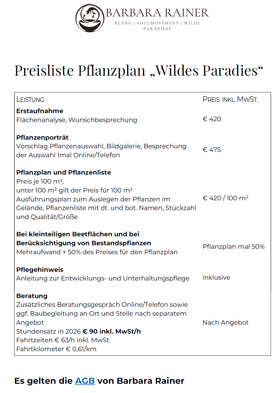 Für dein individuelles Angebot bitte nimm Kontakt zu mir auf unter Tel. 0049-170-3116225 oder E-Mail an info@barbara-rainer.de